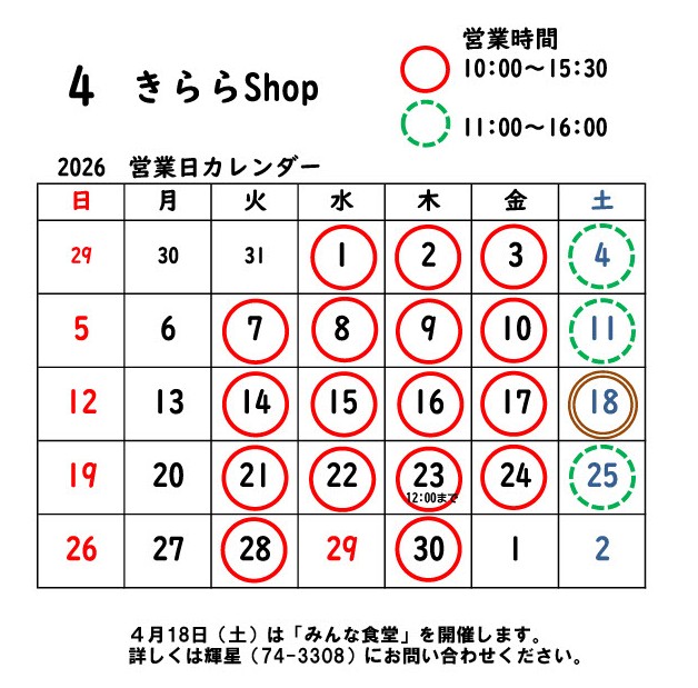 きららショップ・カフェ 4月営業日のお知らせ