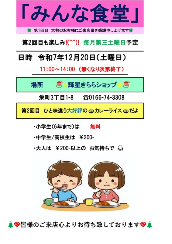 きららショップ・カフェ 12月営業日&みんな食堂のお知らせ